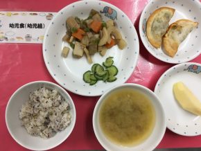 筑前煮 きゅうりのごま和え なめこの味噌汁 リンゴ |