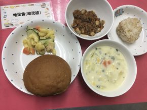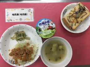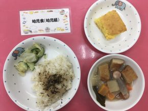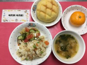 ツナとトマトのスパゲッティ チョコマーブルパン クリスマス唐揚げ 鮭とポテトのグラタン カップサラダ ぶどうゼリー(幼児のみ) フルーツ盛り合わせ |