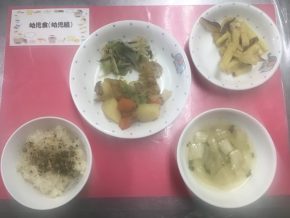肉カレー チンゲン菜の炒め物 じゃがいもサラダ 豆スープ |