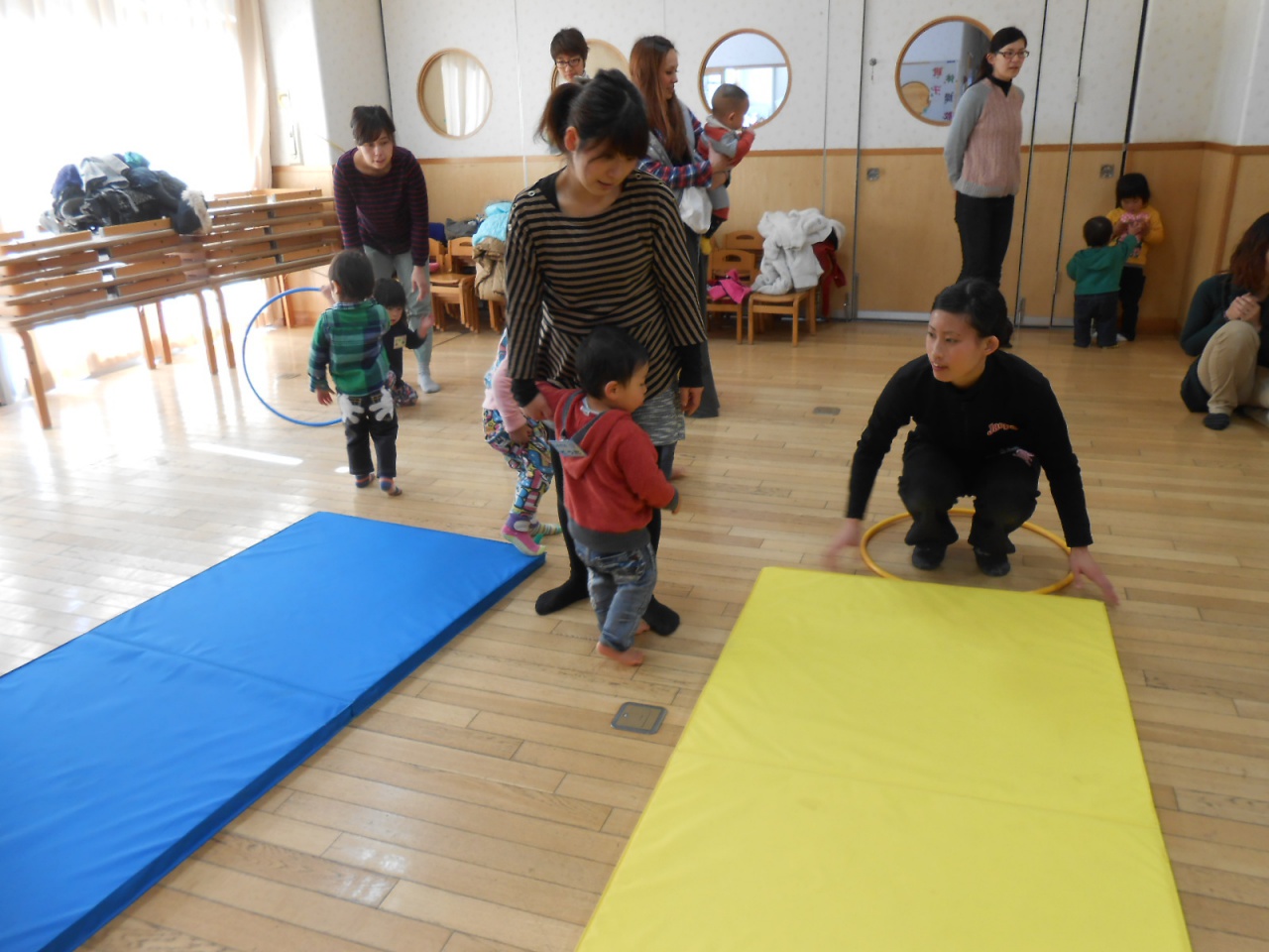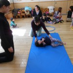 新聞を使った遊びも大好評でした。ストレス解消にもなるね。新聞紙の上にのったり