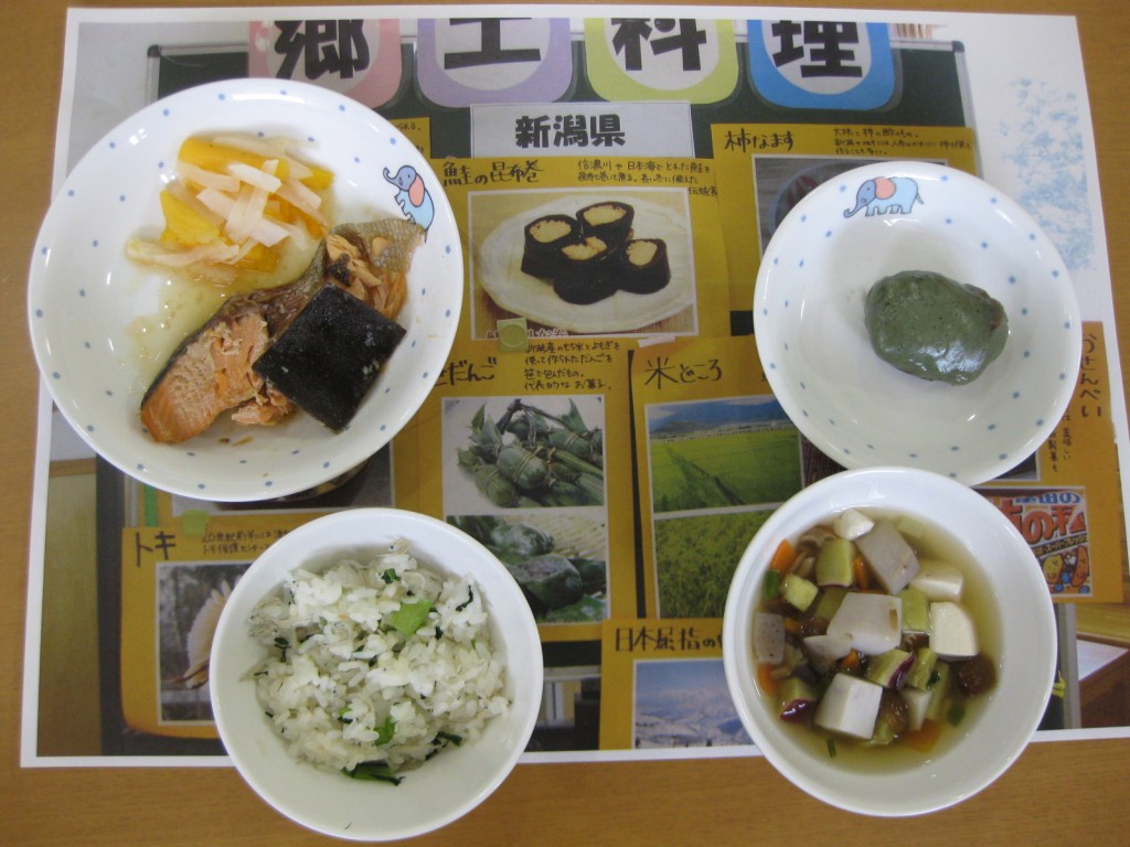 メニューは、じゃこ飯・鮭と昆布の煮物・柿なます・のっぺ汁 おやつは名物 笹団子でした。